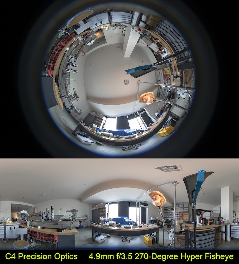 El prototipo Hyperfisheye C-4 de 4,9 mm f / 3,5, como lo llaman (en adelante, “la lente”) apareció por primera vez como lo que parecía ser una broma de los tontos de abril, en el mejor de los casos. “El platillo volante”, como lo llamaban, AKA the Light Bender, AKA la madre de todos los lentes ojo de pez, incluía un diagrama óptico vagamente plausible que mostraba la trayectoria de la luz que viajaba desde el extremo más alejado de su vista, desde aproximadamente 45 grados hacia atrás. la Cámara.