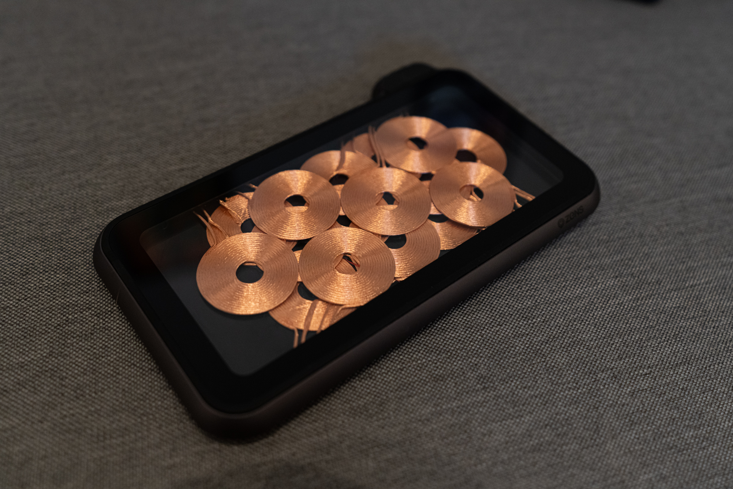 El Zens Liberty es especial por la forma en que usa las bobinas de carga inalámbricas que son responsables de la capacidad de carga de cualquier cargador inalámbrico: bucles circulares de cable de cobre que proporcionan la potencia de inducción recibida por dispositivos como el último estuche de carga de iPhones y AirPods. Zens ha apilado 16 bobinas de este tipo en una matriz superpuesta, que, convenientemente, puede ver con bastante detalle en el cargador de edición de vidrio transparente que está disponible hoy junto con la versión cubierta de tela.