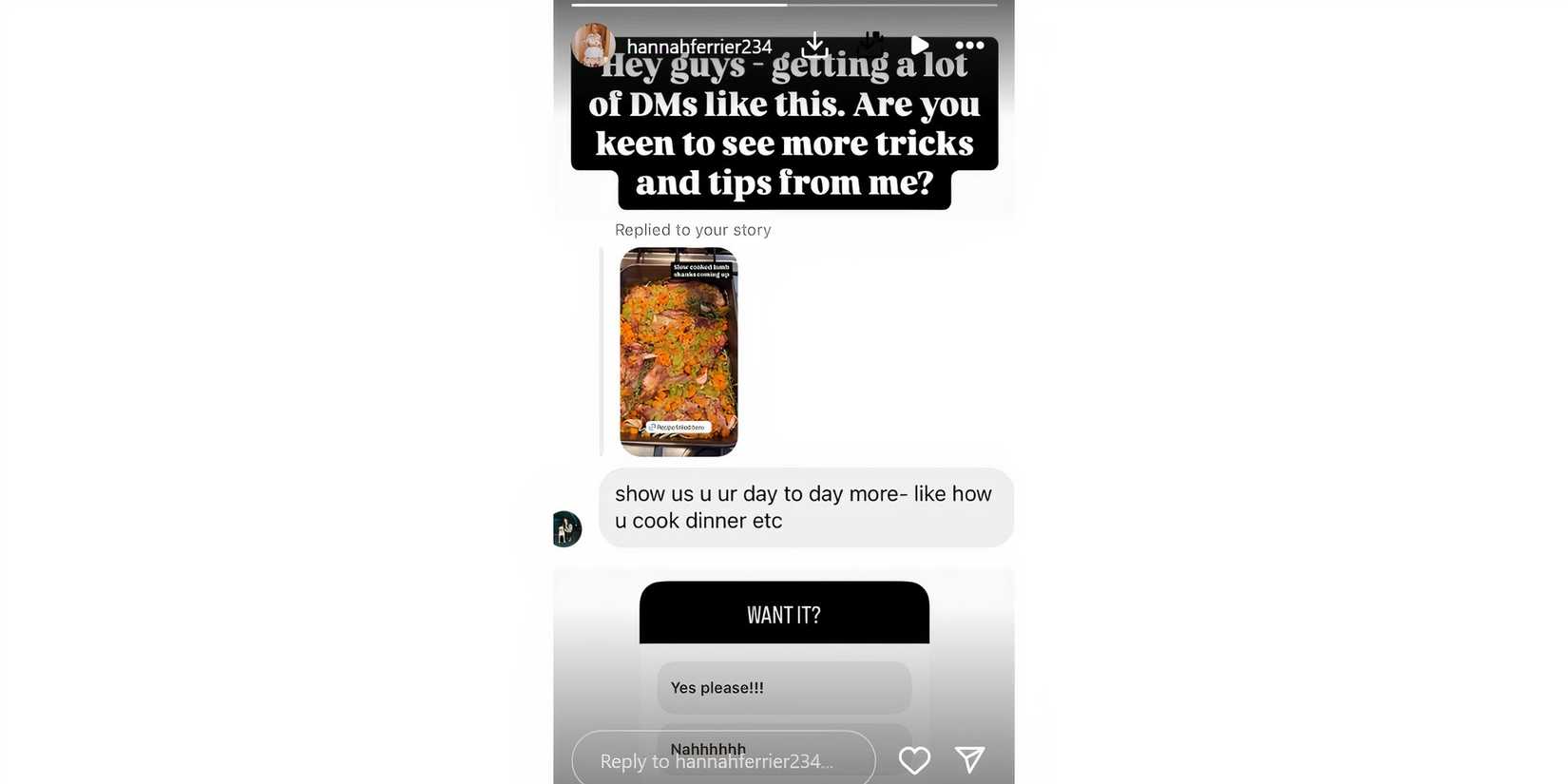 El 20 de abril, Hannah Compartió una historia a su Instagram preguntando si sus fanáticos deseaban ver más de sus actividades diarias, como cómo cocina la cena, etc. Hannah había compartido originalmente una foto de un plato de cordero que había hecho, y uno de sus fanáticos respondió que les gustaría ver más de su rutina diaria. Hannah dijo que a menudo recibe mensajes directos como este, así que Ella creó una encuesta y preguntó a sus seguidores si eran “¿Deseoso de ver más trucos y consejos de mí?” La respuesta fue abrumadoramente sí.