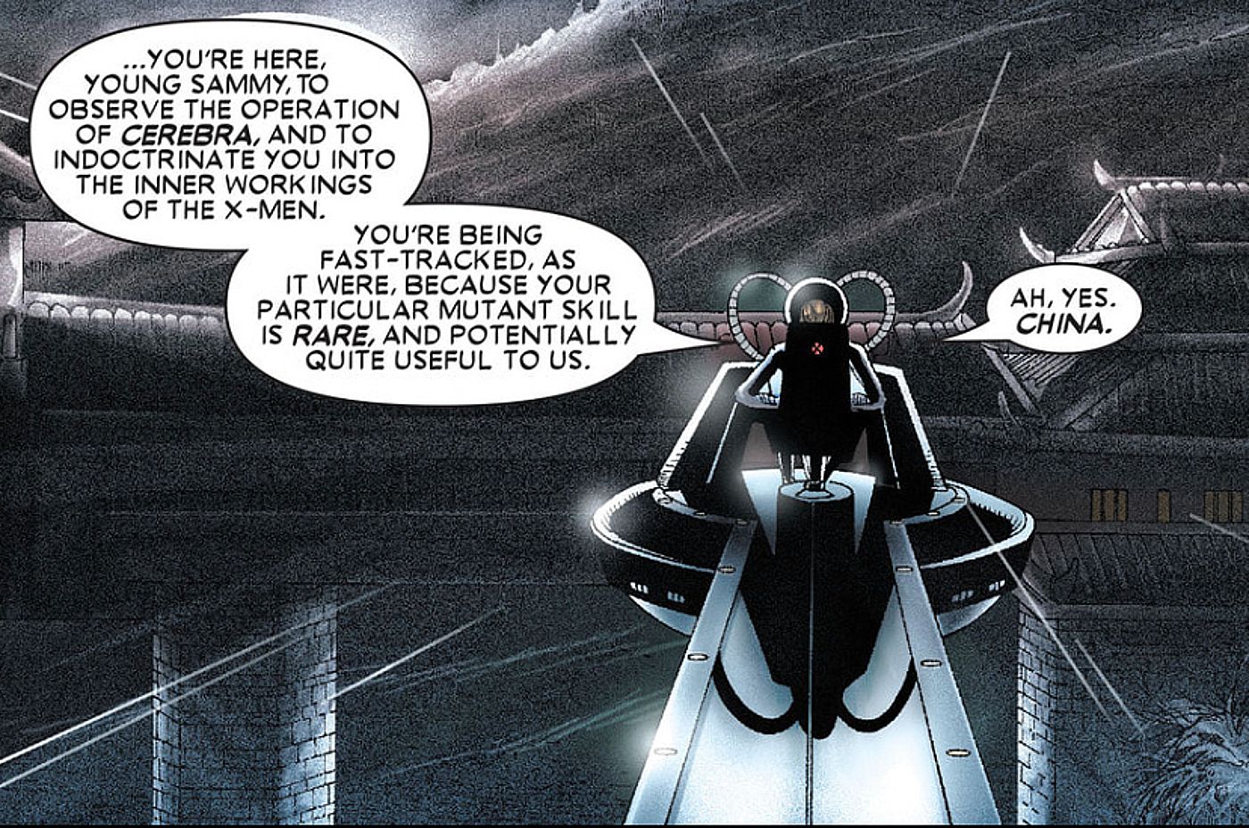 “Estás aquí, joven Sammy, para observar el funcionamiento de Cerebra y para adoctrinarte en el funcionamiento interno de los X-Men. Te están siguiendo rápidamente, por así decirlo, porque tu habilidad mutante particular es rara, y potencialmente muy útil para nosotros.”