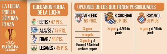 Por una parte en el Sánchez Pizjuán, donde jugará el Athletic ante el Sevilla sabiendo que mantendrá este 7º puesto siempre que gane o empate. También podría hacerlo incluso perdiendo, pero en ese caso necesitaría que en el RCDE Stadium acontezca un empate. El feudo blanquiazul acogerá el duelo entre un Espanyol y una Real Sociedad que, para hacerse con el billete europeo necesitan lo mismo: vencer y que el Athletic pierda en su visita al Sánchez Pizjuán.