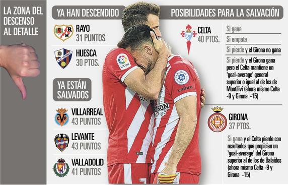 Y por abajo, el Girona es virtualmente nuevo equipo de Segunda, pero existe una combinación de resultados que, aunque poco probable, condenaría al Celta y salvaría a los de Montilivi.