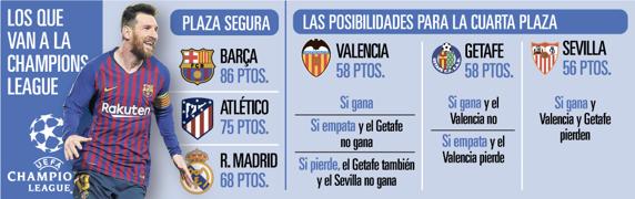 Eso de que hasta que suene el pitido final todo está por decidir cobrará más sentido que nunca en la 38ª y última jornada de LaLiga, que se disputa el próximo fin de semana. El Barça certificó su campeonato hace semanas, Atlético y Real Madrid también tienen asegurada hace tiempo su presencia en la próxima Champions League, pero existe una cuarta plaza para la máxima competición continental que todavía no tiene dueño y por la que pugnan Valencia, Getafe y Sevilla.
