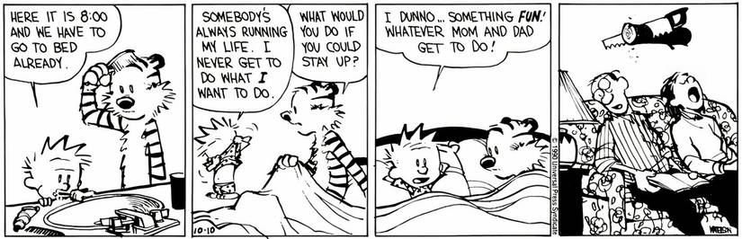 Mientras Calvin se prepara para ir a la cama, se queja con Hobbes de que no tiene absolutamente nada que decir en nada de lo que hace, incluida y especialmente su propia hora de acostarse. Calvin dice que siempre hay alguien que controla cada aspecto de su vida, y ahora Calvin está experimentando la peor parte de primera mano al ser enviado a la cama antes de estar listo.
