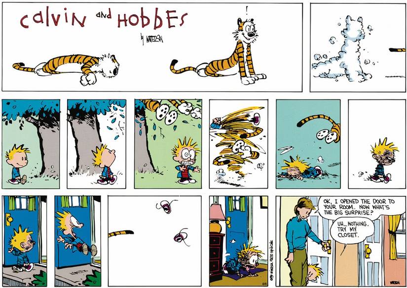 En esta tira cómica, Hobbes evidentemente se siente un poco más travieso de lo normal, y Calvin es el receptor. Calvin estaba caminando a casa cuando de repente escucha un ruido en un árbol encima de él, solo para ser atacado por Hobbes un momento después. Otro ejemplo de esto es cuando Calvin cruza la puerta principal de su casa y Hobbes lo ataca una vez más, dejando a Calvin hecho un desastre después de haber sido atacado dos veces por su amigo tigre. Entonces, antes de que suceda por tercera vez, Calvin decide tomar algunas precauciones y hace que su madre entre a su habitación antes que él.