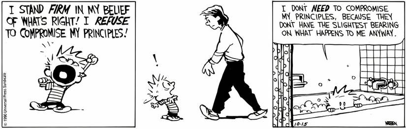 Cuando llega el momento de bañarse, Calvin hace saber que se opone firmemente a la hora del baño en general. Calvin grita acerca de mantenerse fiel a sus principios y cómo se niega a comprometerlos. Sin embargo, sus objeciones no influyen en la decisión de la madre de Calvin de bañarlo, y Calvin termina en la bañera independientemente de su sistema de creencias personal. Una vez en la bañera, Calvin acepta el hecho de que su propia vida está completamente fuera de su control..