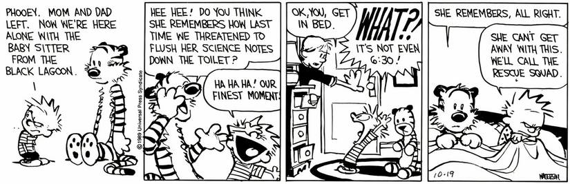 Cuando los padres de Calvin salen a pasar la noche y su niñera, Rosalyn, viene a cuidarlo, Calvin no está muy contento. Calvin llama a Rosalyn “la niñera de la laguna negra“, y hace pucheros diciendo que hay que vigilarlo en absoluto. Mientras Calvin y Hobbes se ríen brevemente de cómo le han hecho bromas a Rosalyn en el pasado, su diversión llega a un rápido final cuando Rosalyn le dice a Calvin que se vaya a la cama antes de su hora de acostarse.