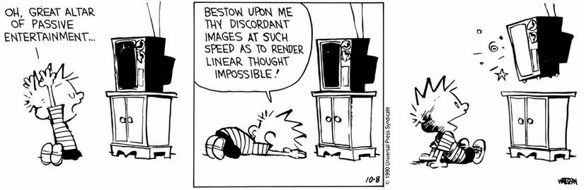 Calvin está frente a su televisor un día, pero no solo lo mira, sino que le reza como si el televisor fuera una especie de dios. Calvin se refiere al televisor como el “gran altar del entretenimiento pasivo“, y lo pide con el mayor respeto y reverencia a “Concédeme tus imágenes discordantes a tal velocidad que haga imposible el pensamiento lineal.“.