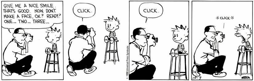 El padre de Calvin está intentando tomarle una foto. Sin embargo, el padre de Calvin sabe con quién está tratando, por lo que no sólo le pide a Calvin que no ponga cara graciosa, sino que también finge tomar la foto un par de veces haciendo el “hacer clic” sonido con su boca. Pero Calvin no es tonto, y sabe exactamente cuándo su padre está a punto de tomar la foto. Y, en ese momento, Calvin hace una mueca graciosa a la cámara.