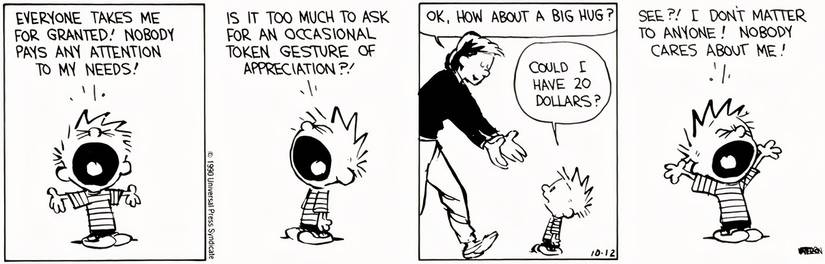 Calvin grita a todo pulmón porque nadie le muestra el nivel de atención o afecto que necesita, alegando que no se satisfacen sus necesidades. Entonces, su mamá se acerca a él y le ofrece un gran abrazo. A eso, Calvin responde: “¿Podría darme 20 dólares?“, una solicitud que su madre rechaza rápidamente. En respuesta, Calvin vuelve a su diatriba anterior y dice que nadie se preocupa por él ya que su madre rechazó su solicitud de dinero gratis.