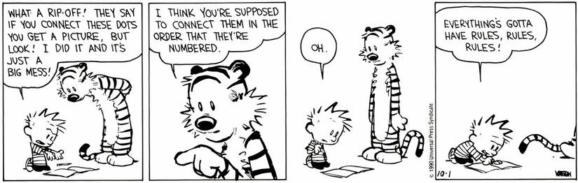 Calvin está trabajando en una actividad para niños, conectar los puntos, pero tiene algunos problemas. Cuando Hobbes se acerca a él, Calvin expresa su frustración con la actividad y dice que no ve ninguna imagen, incluso después de haber conectado todos los puntos. Hobbes luego señala que Calvin necesita seguir la numeración de esos puntos para poder hacerse una idea. Ante eso, Calvin, frustrado, comienza a borrar las líneas que ya dibujó, murmurando para sí mismo: “¡Todo debe tener reglas, reglas, reglas!“.