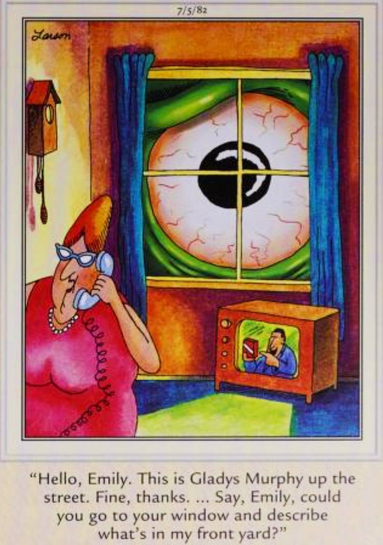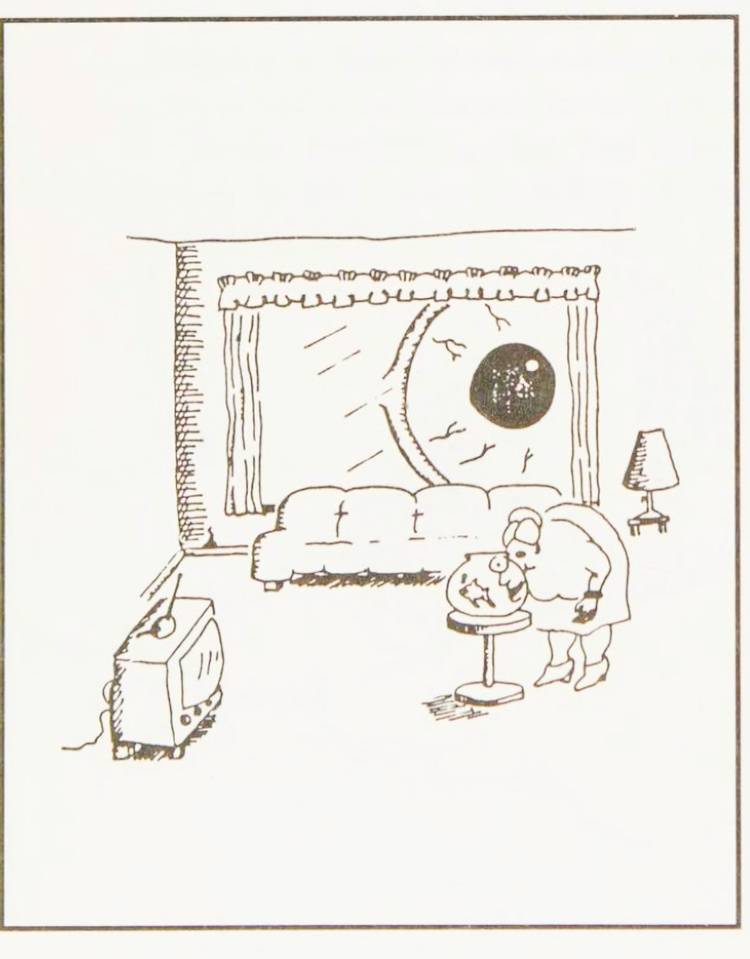 Este es otro Camino de la naturaleza caricatura que luego inspiró un Lado lejano “Secuela” tipo. En este panel escasamente ilustrado, una mujer se ocupa de sus propios asuntos en su sala de estar, bueno, no tranquila, en realidad se ocupa de los asuntos de su pescado de mascotas, presionando su ojo contra el vaso de su tazón, al igual que el ojo gigante y sin sangre de un monstruo no identificado hace lo mismo, mirándole omino a través de su ventana frontal. Una vez más, la perspectiva cómica de Gary Larson, que haría El lado lejano Famoso y notorio, parece completamente formado aquí.