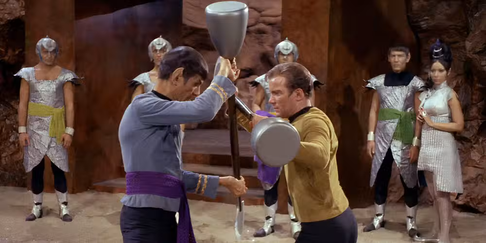 T’pring elige al Capitán Kirk para que sea su campeón y Battle Spock hasta la muerte, con el oficial de ciencias creyendo que mató a su mejor amigo. El shock y alivio genuino de Spock para encontrar a Kirk vivo es uno de sus momentos más conmovedores.