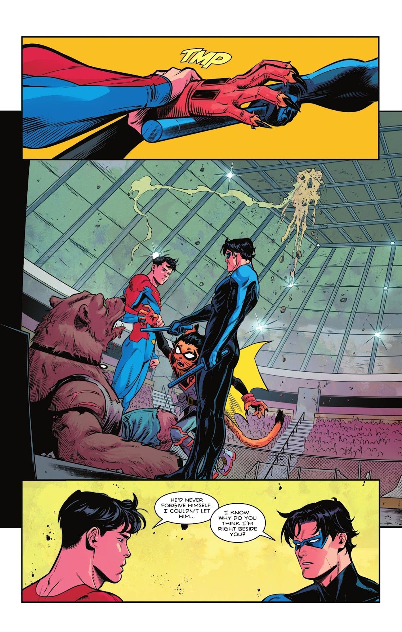 Durante los eventos de “Beast World”, Damian es uno de los muchos transformados en un híbrido humano-animal, y Robin adopta una presencia más felina. Mientras Dick y Jon Kent intentan encontrar su paradero, lo rastrean a media milla debajo de Gotham en The Pit, donde estos híbridos de animales se ven obligados a entrar en combate en una especie de club de lucha clandestino. Sin darse cuenta de sus instintos, Damian intenta matar a su oponente, pero Jon y Dick lo detienen justo a tiempo.