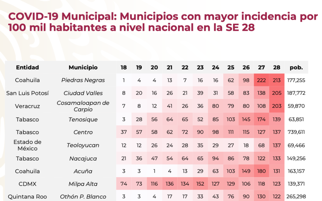 La Secretaría de Salud presentó los 10 municipios del país que en la semana epidemiológica 28 registran una mayor incidencia o transmisión del coronavirus SARS-CoV-2 por cada 100 mil habitantes.