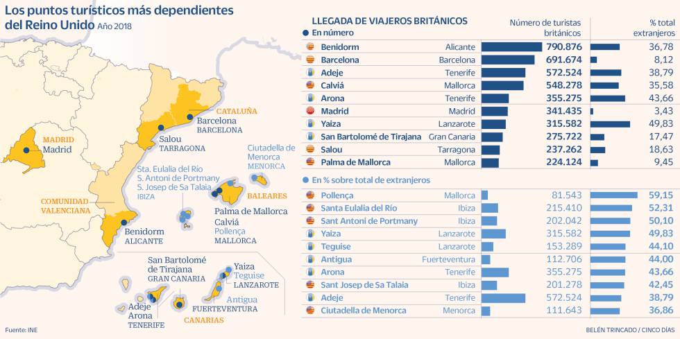 Canarias es otro de los destinos más afectados por el frenazo del turismo británico. Jorge Marichal, presidente de la patronal hotelera Ashotel, que representa a Tenerife, La Palma, El Hierro y La Gomera, y de la estatal Cehat, precisa que las zonas más afectadas son Tenerife y Lanzarote. Adeje ese el tercer destino en España, tras Benidorm y Barcelona, que más viajeros británicos recibe, con 573.000 turistas, un 38,8% del total, y Arona, otro municipio tinerfeño, aparece en quinto lugar, con 355.275 viajeros británicos, con un 43,6% sobre el total. “Llevamos meses trabajando para reducir la fuerte dependencia del mercado británico y apostar por otros mercados, como Francia o los países del Este, pero nuestro margen de actuación es mucho menor que el de Benidorm, ya que ellos cuentan con un mercado penínsular que puede llegar en coche y Canarias depende en exclusiva de la conexión aérea”.