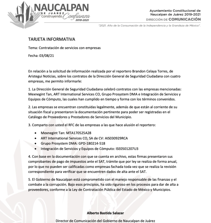 A consulta de este reportero, el Ayuntamiento de Naucalpan de Juárez envió una tarjeta el 3 de agosto del 2021, en la que el gobierno municipal dio respuesta a esta investigación mediante cinco puntos.