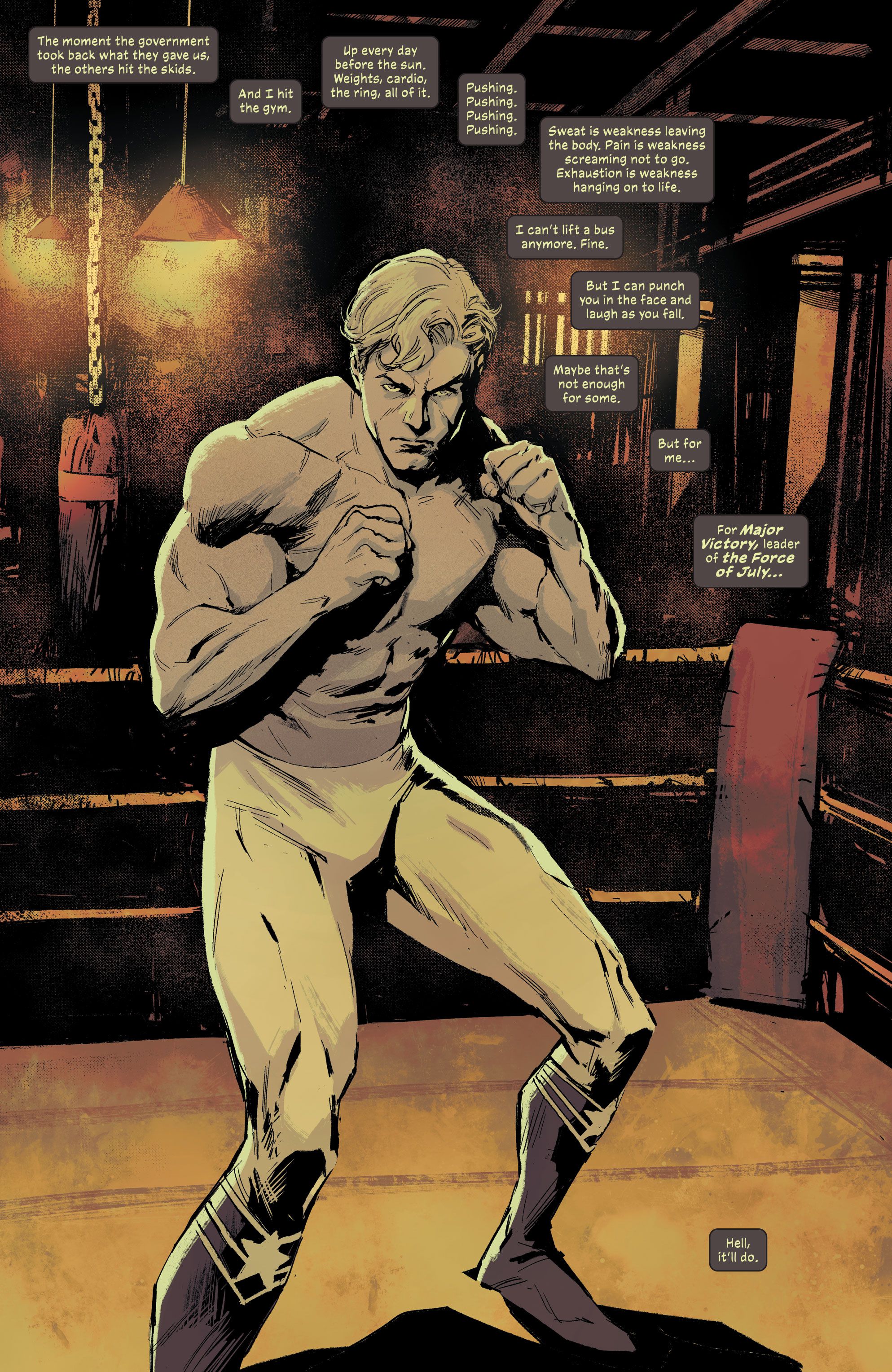 La vista previa termina con un amargado Major Victory, el líder del grupo, que revela que ha pasado todos los días desde que perdió sus poderes entrenando, lo que lo convierte en un rival físico formidable para Batman.