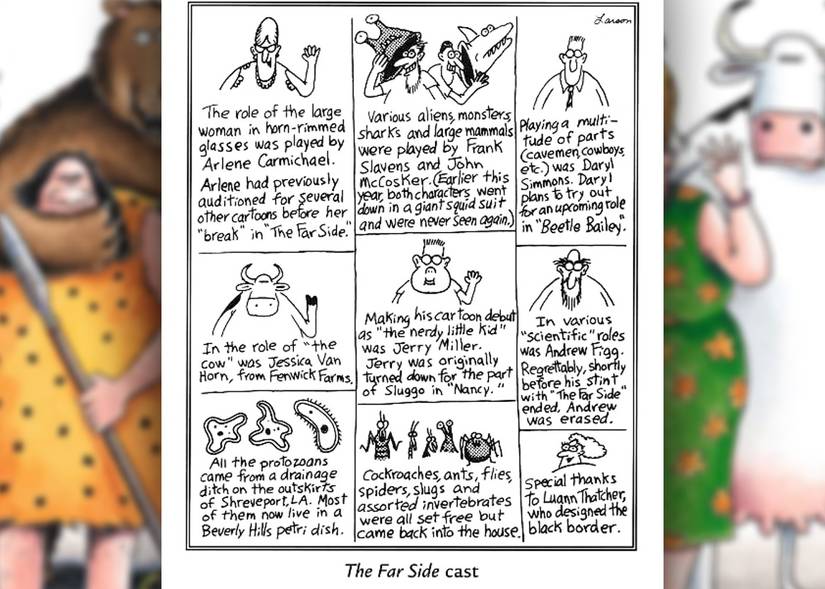 Como él comparte El lado opuesto completoGary Larson nunca quiso tener personajes recurrentes porque quería poder tratarlos mal sin ofender a los lectores. Cada Lado lejano La tira sería una mirada singular a un mundo único, donde lo surrealista y morboso podría tener lugar sin que ningún personaje querido tenga que sufrir. Sin embargo, como El otro lado corrió, Los fanáticos de Larson comenzaron a notar arquetipos que usaba una y otra vez.como el “niño nerd” y “mujer con gafas de carey”. Larson finalmente satirizó sus propios personajes repetidos con un cómic que presentaba al “elenco” de El otro lado.
