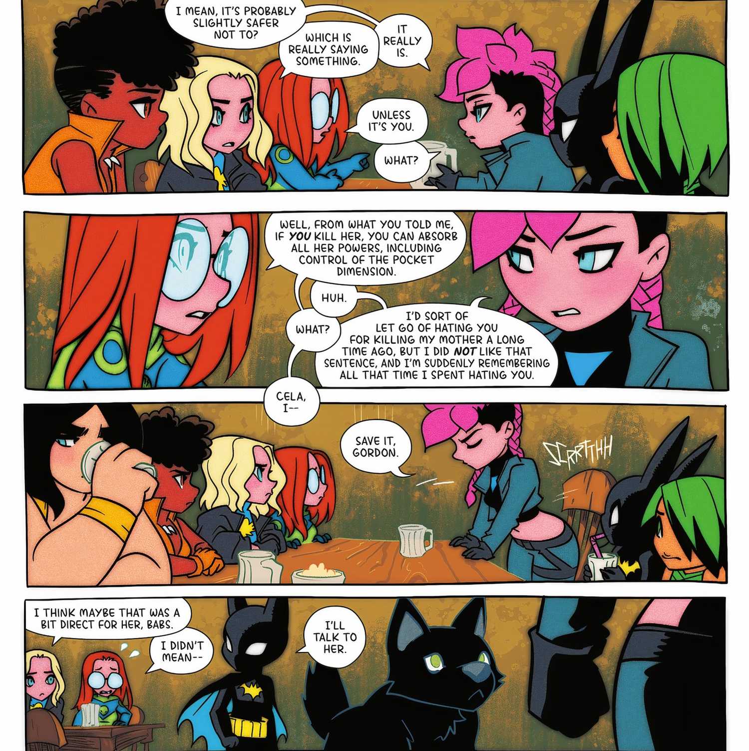 La situación actual de las Aves de Presa, que las tiene atrapadas en una dimensión de bolsillo en constante cambio mientras intentan escapar de la poderosa (y asesina) Maia, crea las condiciones perfectas para que la personalidad realista de Batgirl brille. La forma más sencilla para que el equipo escape de la dimensión de bolsillo es asumir el control de los portales, y la forma más rápida de lograrlo es que Cela mate a Maia y absorba sus poderes. Es una idea sólida en el papel, y admito que Me alegró mucho ver un plan tan brutal ejecutado de una manera tan clásica y sin filtros como la de Babs.aunque comprensiblemente fue mal recibido por Cela.