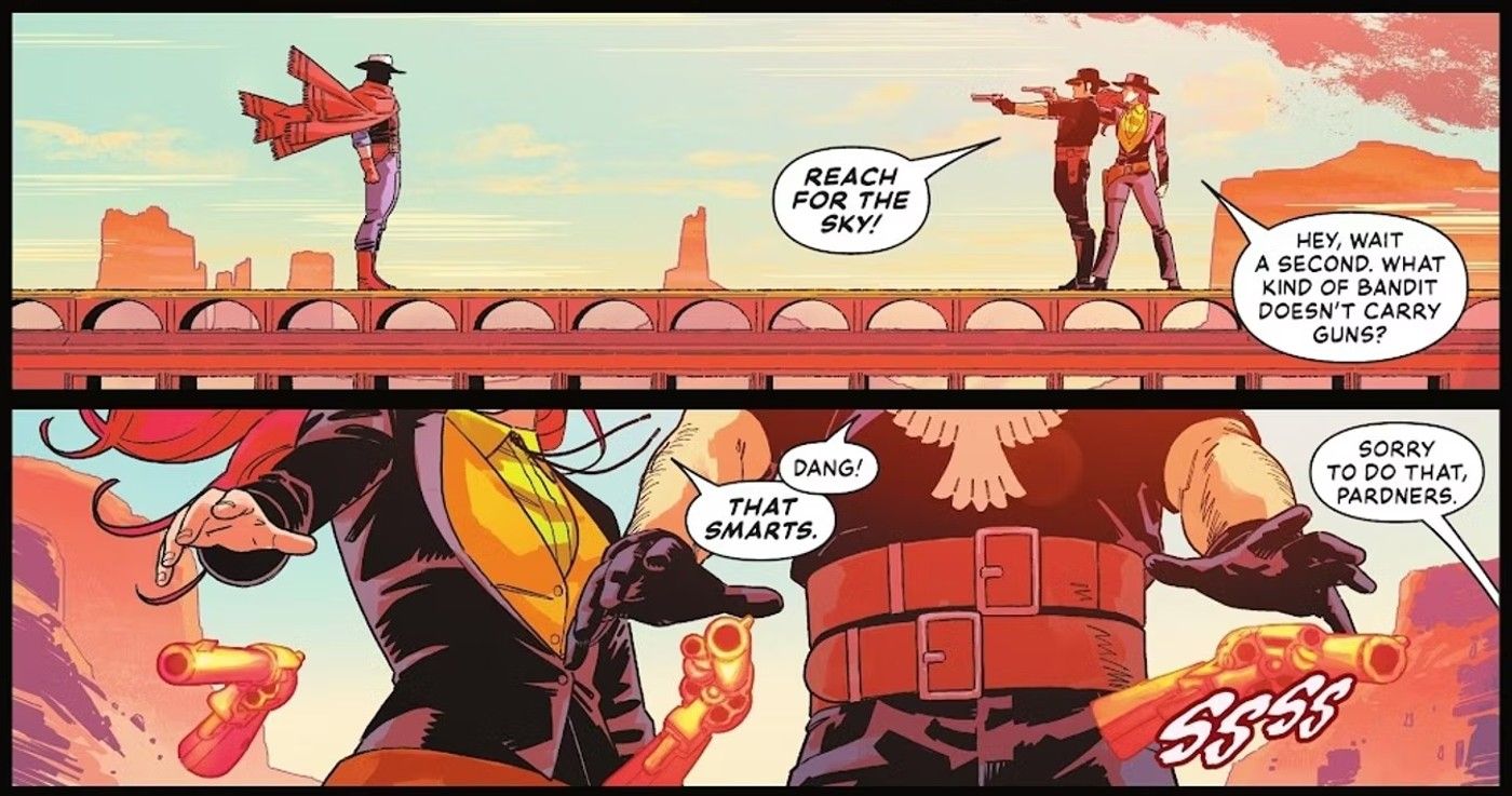 La regla de Superman de no tener armas es una ley personal que él mantiene hasta el día de hoy, incluso cuando se convierte en un bandido de temática occidental en Superhombre #9 de Joshua Williamson y Bruno Redondo. En este número de la serie insignia Dawn of DC, el último hijo de Krypton es transportado inesperadamente a los clásicos días occidentales de antaño.