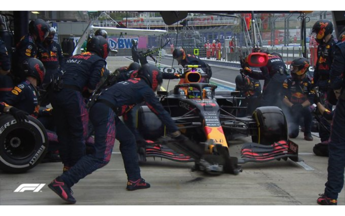Pero, ocho vueltas después, apareció la primera pifia del equipo austriaco. Casi nueve segundos en boxes para cambiarle las gomas al mexicano… ¡Una eternidad!