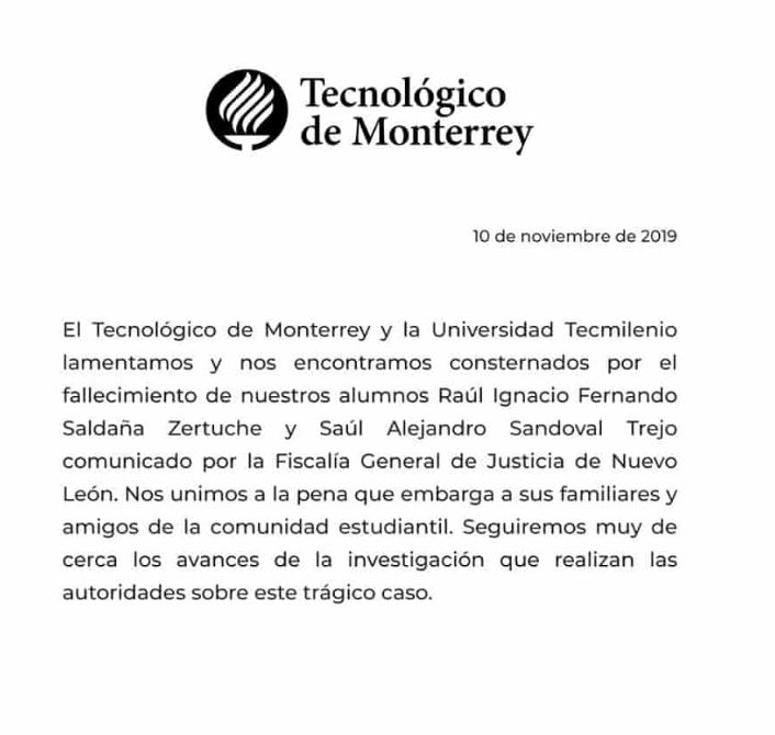 El Tecnológico de Monterrey y la Universidad Tec Milenio lamentaron los hechos por medio de un comunicado y las instituciones dijeron que estarán atentas a las investigaciones.