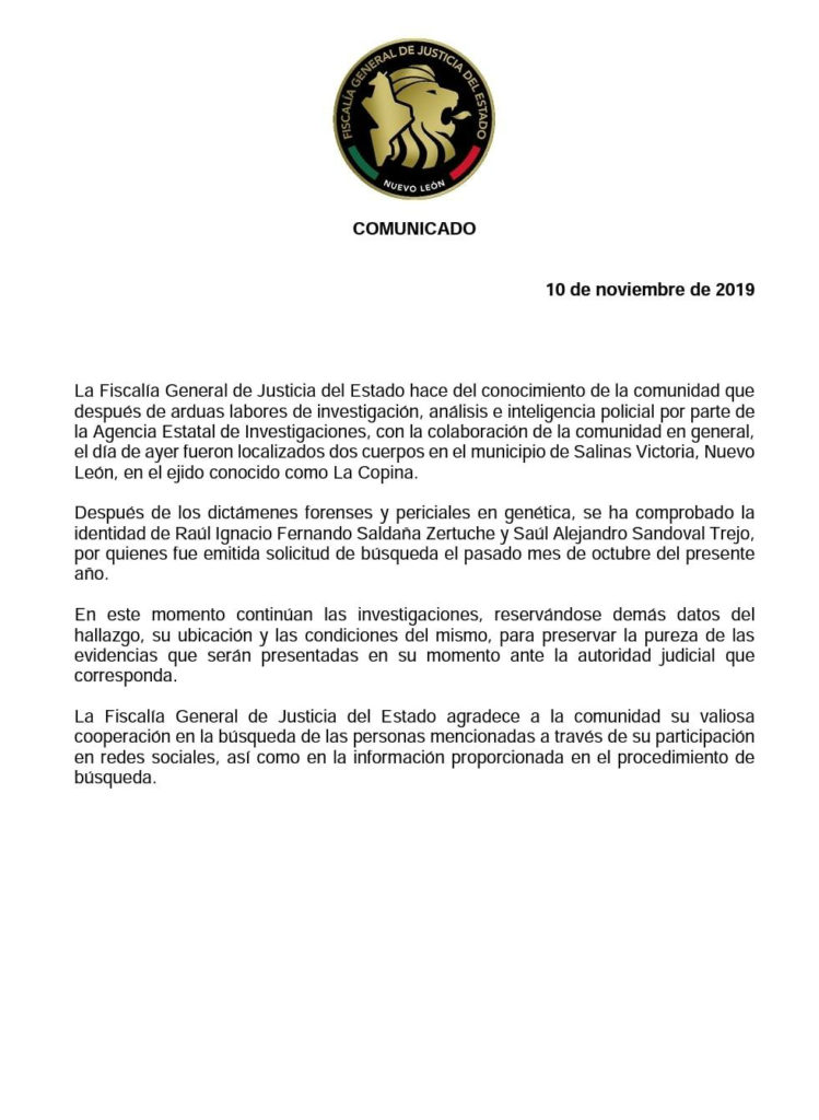 Luis Enrique Orozco dijo que Raúl Ignacio Fernando Saldaña Zertuche de 23 años y Saúl Alejandro Sandoval Trejo de 22, cuyos cuerpos fueron localizados el pasado fin de semana en el ejido La Copita del municipio de Salinas Victoria, Nuevo León, por elementos de la Fiscalía General de Justicia de Nuevo León (FGJNL), fueron secuestrados en Monterrey y posteriormente asesinados y enterrados en la ranchería.
