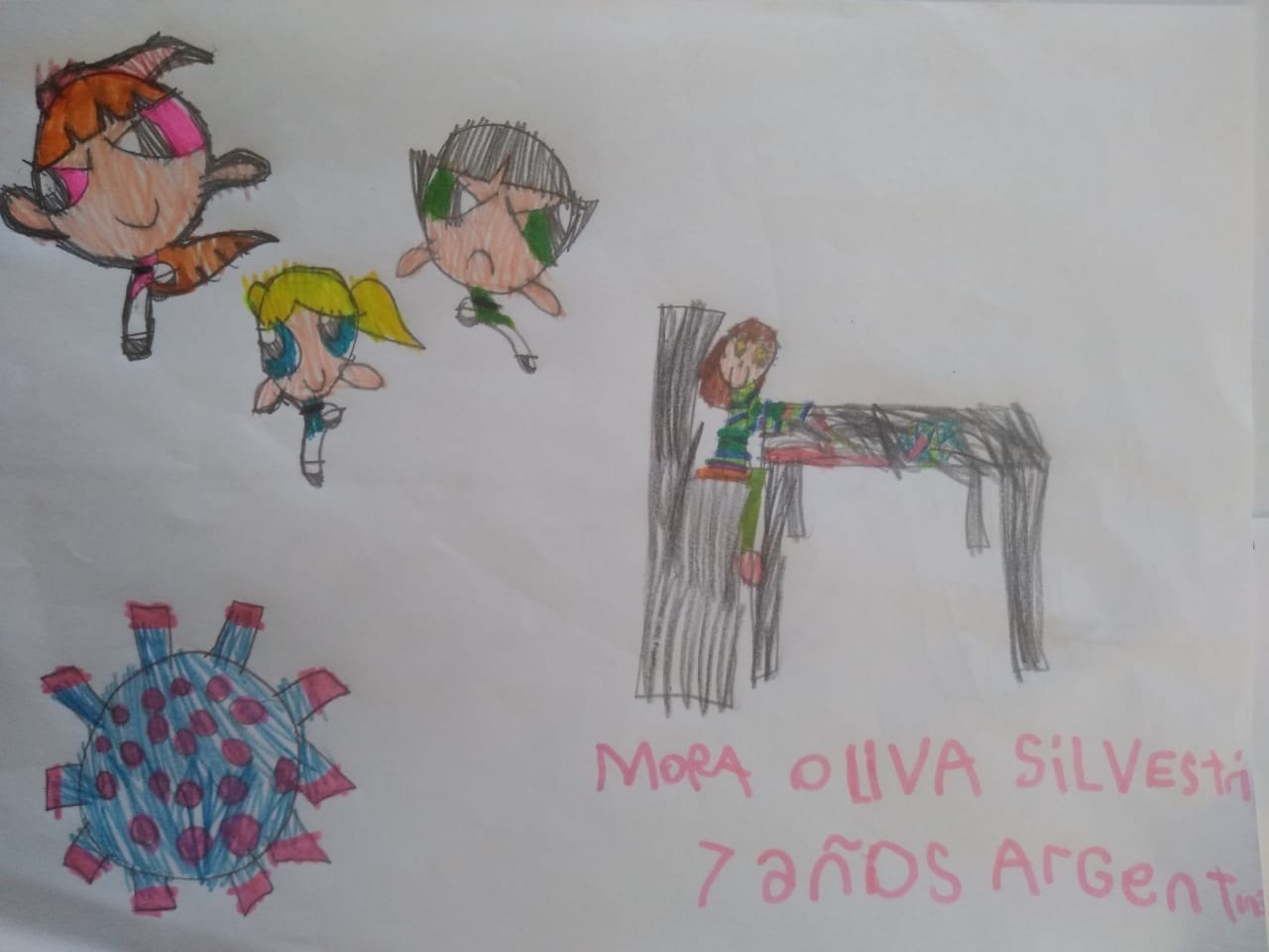 En la imaginación de los niños, el nuevo coronavirus se parece a un villano de caricaturas. Mora Oliva Silvestri retrata cómo la defienden de él las Chicas Superpoderosas.