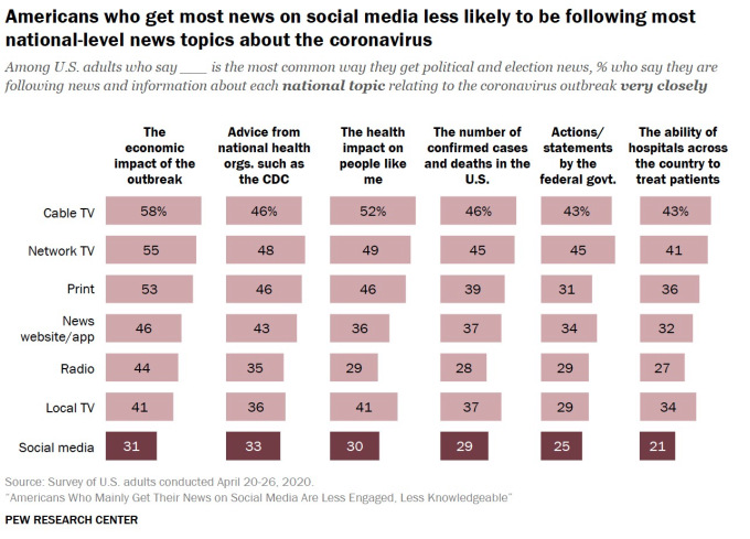 Sobre el tema del brote de coronavirus, solo alrededor de una cuarta parte (23%) de los principales consumidores de noticias de medios sociales dijeron que seguían las noticias de COVID-19 “muy de cerca”. Todos los demás grupos informaron nuevamente un porcentaje más alto, incluidos aquellos que utilizaron principalmente la televisión por cable (50%), la televisión de la red nacional (50%), los sitios web y aplicaciones de noticias (44%) y la televisión local (32%) para las noticias.