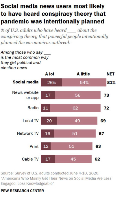 El grupo de consumidores de noticias de las redes sociales también estuvo más expuesto a conspiraciones marginales, como la idea de que la pandemia se planeó intencionalmente. Casi una cuarta parte (26%) de los que principalmente recibieron sus noticias a través de las redes sociales dijeron que habían escuchado “mucho” sobre esta conspiración, y un 81% dijo que tenían al menos “un poco”. Esto fue significativamente más alto que todas las otras plataformas de noticias, y una indicación de cuánta conspiración puede extenderse a través de las redes sociales.