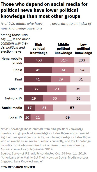 En nueve preguntas relacionadas con el conocimiento político fundamental, solo el 17% de los consumidores de noticias de las redes sociales obtuvieron un “alto conocimiento político”, lo que significa que obtuvieron entre ocho y nueve preguntas correctas; El 27% obtuvo un “conocimiento político medio” (seis y siete a la derecha) y el 57% obtuvo un “conocimiento político bajo” (cinco o menos a la derecha). El único grupo que tuvo un peor desempeño fueron aquellos que se basaron principalmente en la televisión local.