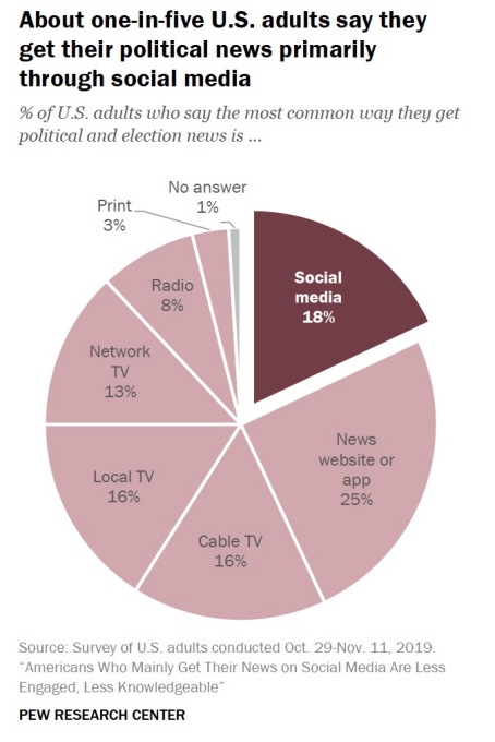 Aproximadamente uno de cada cinco (18%) dijo que usa principalmente las redes sociales para mantenerse al día. Eso es cerca de los porcentajes de aquellos que dicen que usan noticias locales de TV (16%) o televisión por cable (16%), pero menos que aquellos que dicen que van directamente a un sitio web o aplicación de noticias (25%). Otro 13% dijo que usa la televisión en red y solo el 3% dijo que leía un periódico.