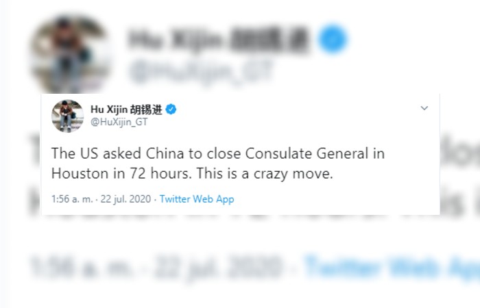 Los comentarios de Wang se produjeron después de que Hu Xijin, editor en jefe del periódico Global Times, dijera en Twitter que Estados Unidos había dado a China 72 horas para cerrar el consulado.