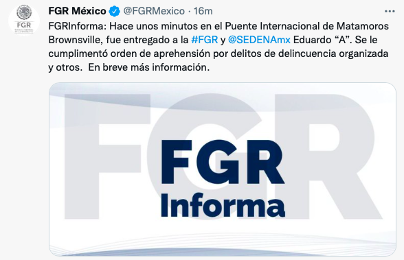 “Se le cumplimentó orden de aprehensión por delitos de delincuencia organizada y otros. En breve más información”, se lee en el mensaje que la FGR publicó en Twitter.