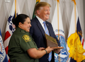 Durante la mesa redonda la agente especial de origen latino, Gloria Chavez, a cargo de la Patrulla Fronteriza, entregó a Trump un pedazo de metal con el que están construyendo la barrera que Trump fue a inspeccionar.