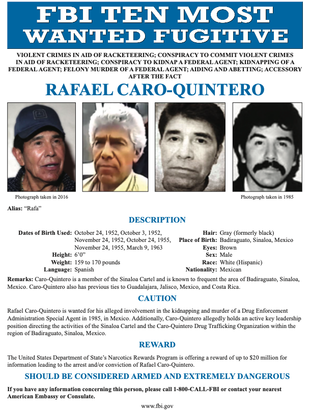 En abril de 2018, la Policía Federal estadounidense (FBI, por sus siglas en inglés) incluyó a Caro Quintero en su lista de los diez fugitivos más buscados, donde aún figura. Además, el Departamento de Estado ofreció una recompensa de 20 millones de dólares por información que condujera a su captura o condena, que aún está vigente.