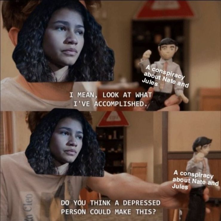 Si bien suena como una teoría de la conspiración total, la hipótesis de Rue es totalmente cierta. Nate, un jugador de fútbol tóxico y abusivo con inseguridades sexuales, definitivamente chantajeó y manipuló a Jules, quien aún no se ha sentido lo suficientemente cómodo como para compartir esta terrible situación con nadie más, incluso con Rue.