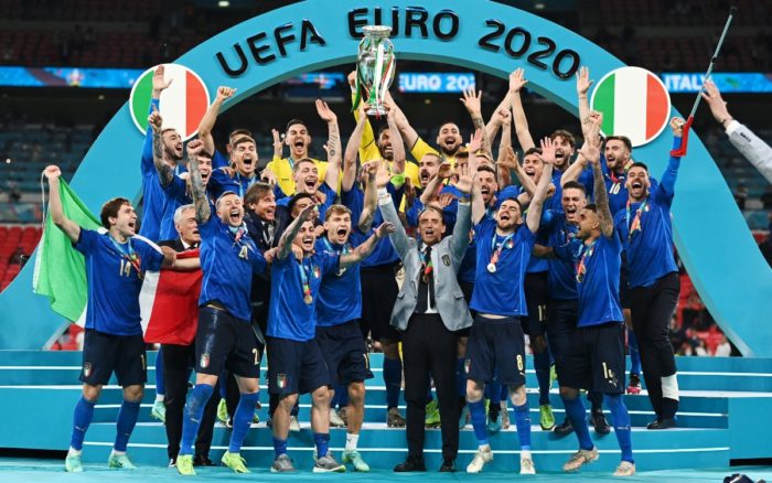 Italia se proclamó campeón de la Euro 2020, segundo título de su historia (1968), tras igualar 1-1 con Inglaterra en tiempo regular, pero imponerse en la tanda de penales 3-2, gracias a las atajadas de su arquero Gianluigi Donnarumma, encuentro celebrado ante un lleno en Wembley Stadium de Londres.