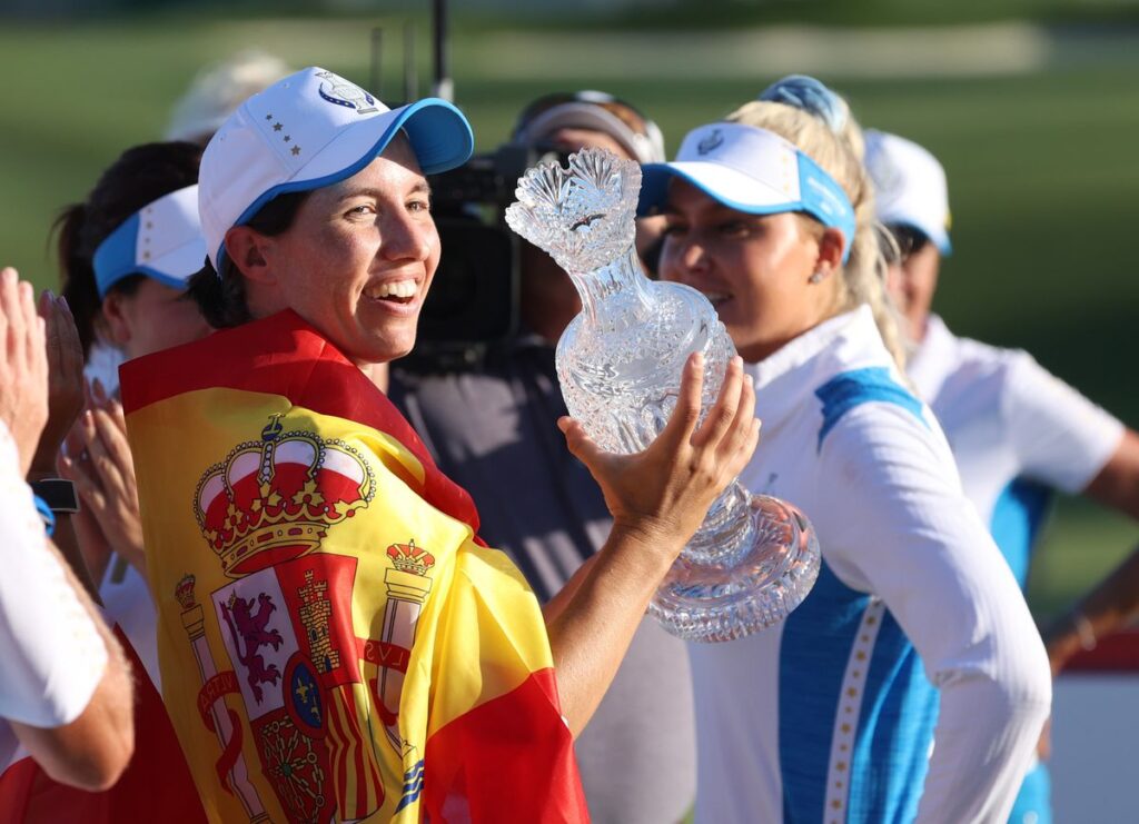 Estados Unidos despertó con algunas de sus figuras. Lexi Thompson arañó un empate ante la sueca Anna Nordqvist y Nelly Korda, la número uno del mundo, oro en los Juegos de Tokio, puso el 12,5-8,5 con su triunfo ante la inglesa Georgia Hall (uno arriba). La rebelión aún continuaría con las victorias de Megan Khang contra la alemana Sophia Popov (3&2) y de Brittany Altomare sobre Carlota Ciganda. La navarra, la representante española en el equipo europeo, una veterana en su quinta Solheim, había llegado a remar con dos hoyos de ventaja, pero cedió su renta para caer por 2&1. Europa dominaba por 13-11 cuando un putt de la finlandesa Matilda Castren puso el punto definitivo, rematado en los duelos finales hasta el 15-13. Las golfistas europeas reinaban en Estados Unidos.
