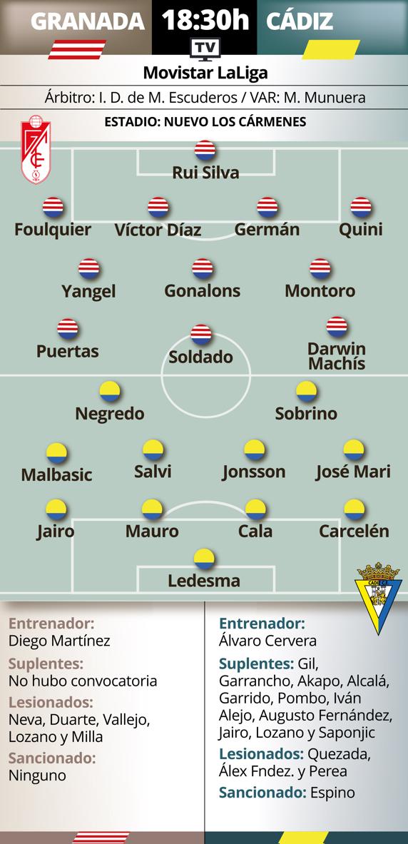 En el Cádiz causan baja los centrocampistas Álex Fernández y Alberto Perea, los dos por lesión. El lateral izquierdo uruguayo Luis Alfonso Espino vio la quinta tarjeta amarilla en Valladolid y también se perderá el partido de Granada por sanción.