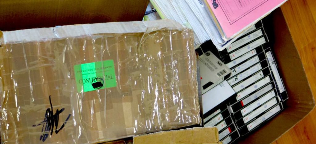 “Los videos fue otra labor muy complicada porque son 300 videos en formato Beta, muchos de ellos fueron dañados por el polvo que descompuso la imagen. Esa fue una labor en conjunto con el Poder Judicial, sobretodo con el área de transparencia, que entre dos personas tratamos de pasar a formato reproducible la mayor cantidad de esas imágenes”, detalló.