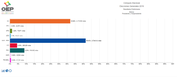 De acuerdo con los resultados, el presidente alcanzó una ventaja de 10.02 por ciento sobre su rival Carlos Mesa, por lo que sería reelegido para un cuarto mandato sin necesidad de una segunda vuelta.