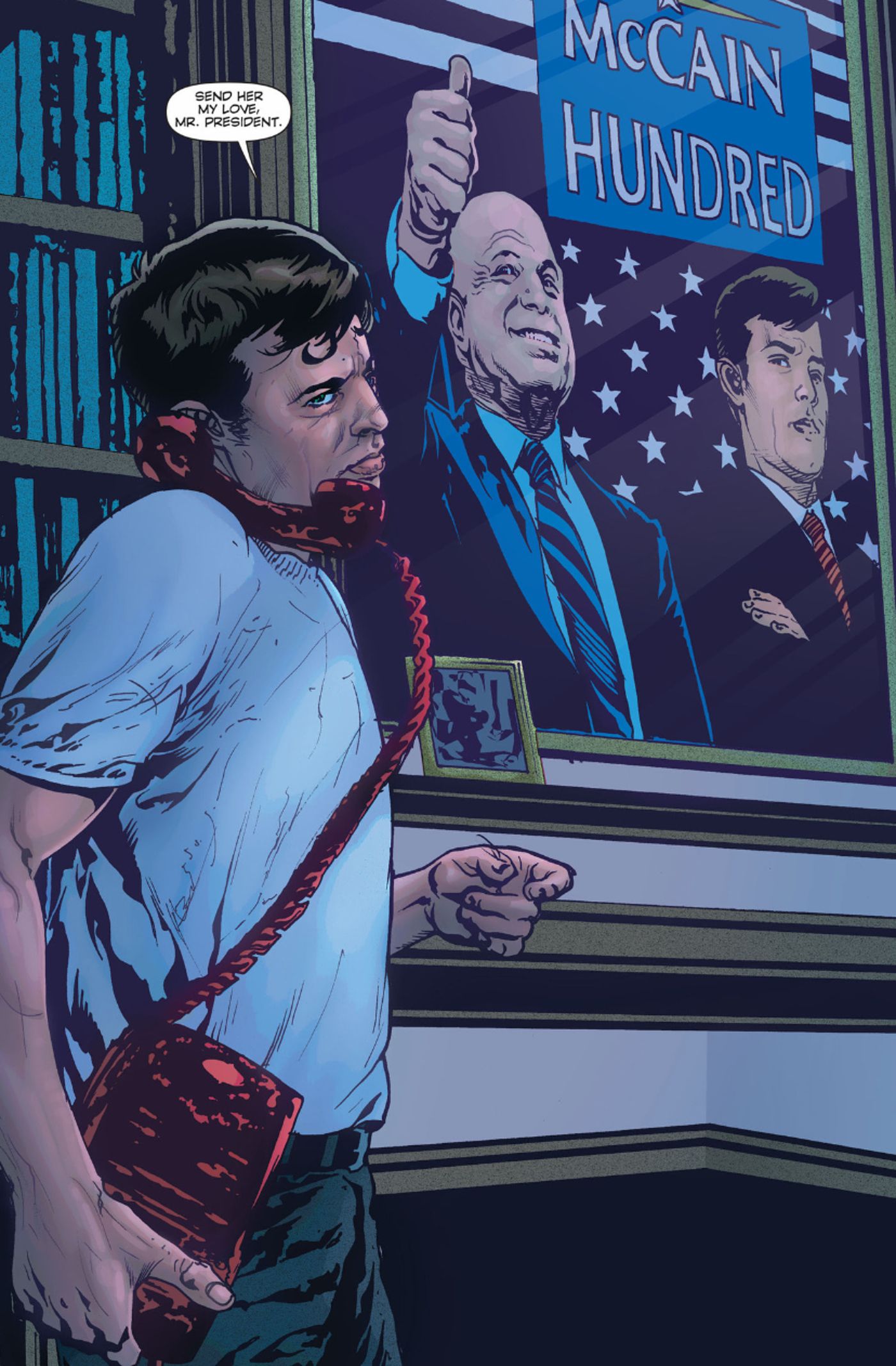 “/> La escena del número 1 llevó a los lectores a esperar que la carrera política de Hundred terminara en un fracaso; la cuestión final revela lo contrario: ha ascendido a la Vicepresidencia, bajo la presidencia de John McCain. Sin embargo, dada la política liberal de Hundred a lo largo de la serie, el personaje termina sirviendo en una administración republicana. destaca que ha elegido la ambición antes que los ideales.