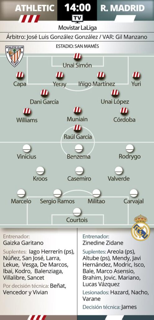 Zidane volverá a hacer cambios en el once. Militao entrará por el lesionado Varane, mientras todo apunta que Marcelo regresará al once por Mendy. En la medular, Valverde será titular por Modric y arriba, Zidane apostaría por un tridente formado por Rodrygo, Benzema y Vinicius. El que no estará en Bilbao es Hazard. El belga sigue con molestias en el tobillo derecho y por segundo partido consecutivo, Zidane no puede contar con el belga.