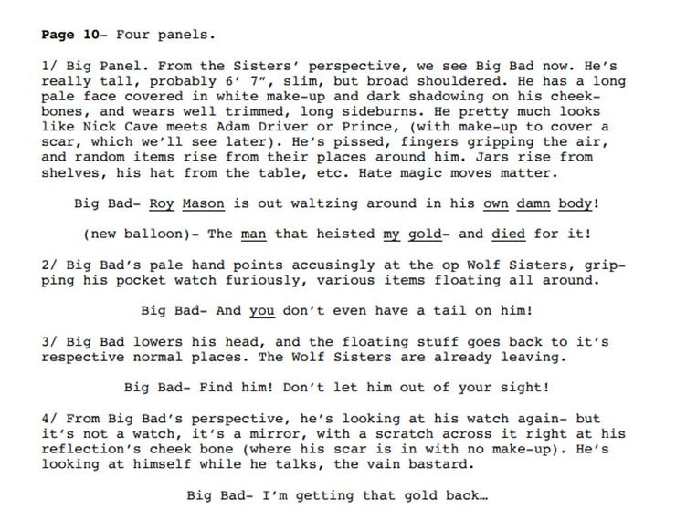 Big Bad, en el guión, se describe como una mezcla de Nick Cave, Adam Driver y Prince. Esta combinación de dos cantantes y el actor que retrató Guerra de las GalaxiasKylo Ren es una mezcla inesperada, aunque ciertamente explica la conducta performativa que Big Bad parece tener en sus posturas. También proporciona información adicional sobre su personaje, revelando su vanidad, su imponente estatura y el más breve vistazo a sus habilidades. También revela lo que alimenta su magia: el odio. Estas pequeñas ideas agregan un desarrollo significativo y un vistazo a las nuevas inspiraciones en el diseño de personajes de cómics que los lectores generalmente no tienen la oportunidad de ver. Aquí está el producto terminado, y una vista previa de lo que les espera a los lectores: