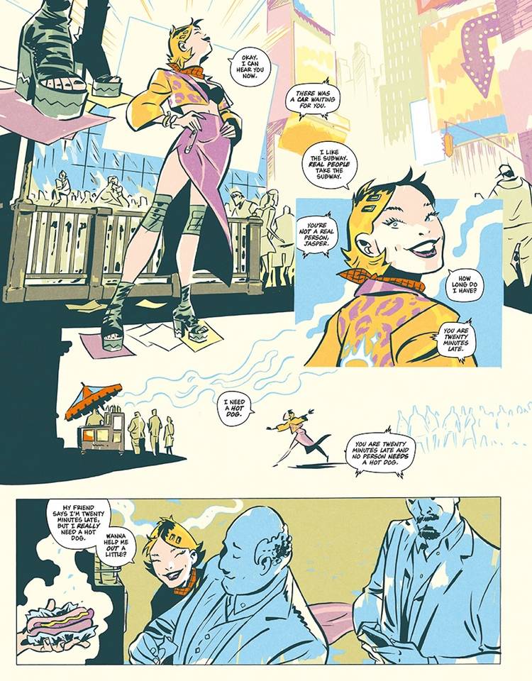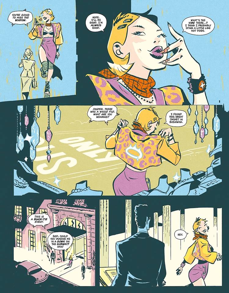 Si Jasper Jayne es el gancho visual de este cómic, con su brillante sonrisa, su melena rubia y sus cuchillos ensangrentados, entonces Zara es su corazón humano y defectuoso. Gran parte de esta historia trata sobre la trágica diferencia entre sueño y realidad o, más exactamente, entre lo que imaginamos sobre lugares, trayectorias profesionales y otras personas y la dura realidad de lo que son sin el barniz.