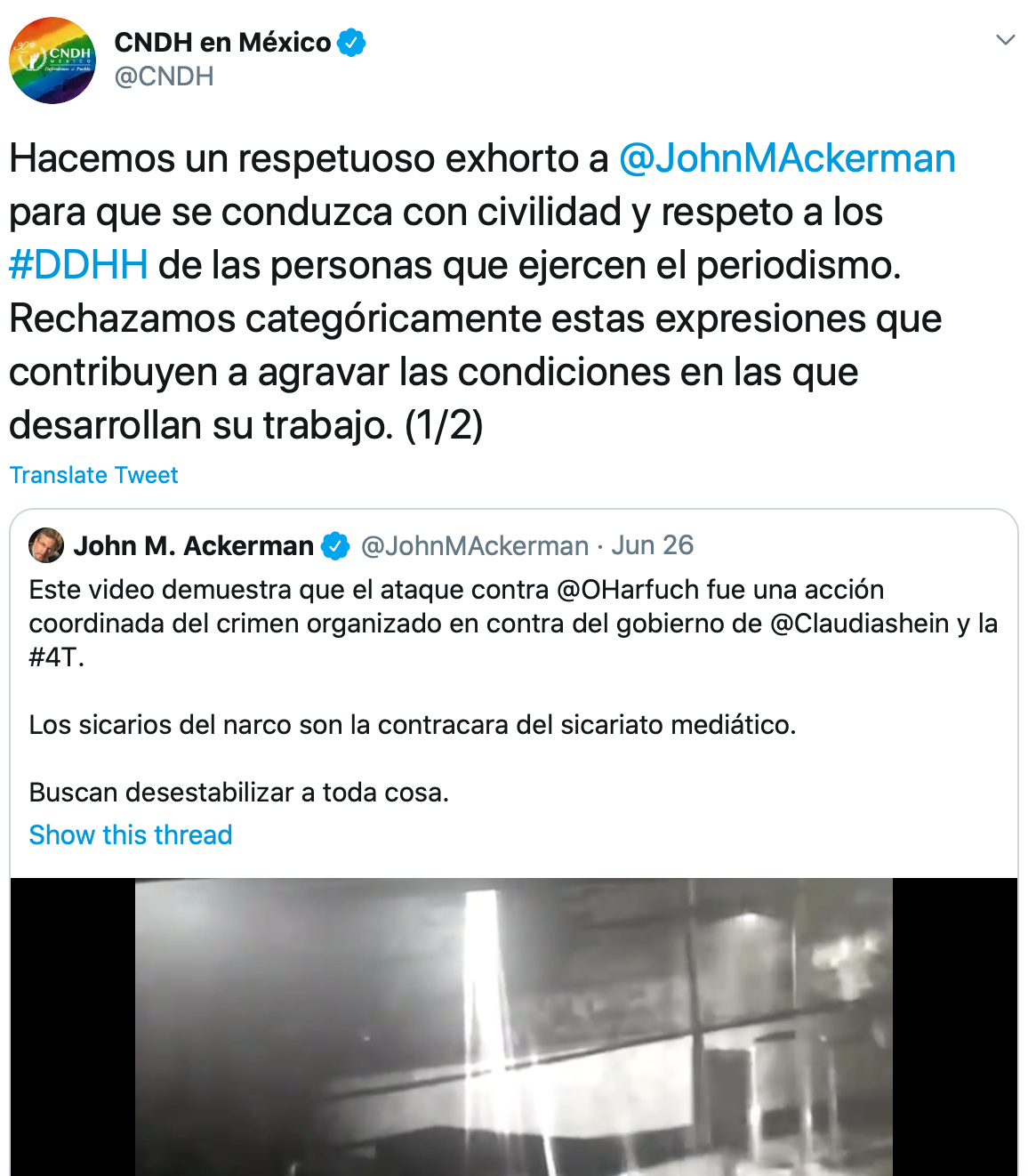 Dos días después de que Ackerman se refirió a un “sicariato mediático”, la CNDH hizo un exhorto al académico para que respete “los derechos humanos” de los periodistas.