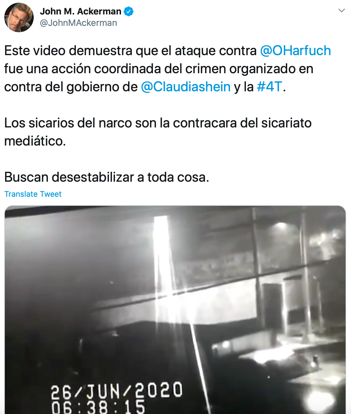 En su tuit del 26 de junio pasado, Ackerman, esposo de la Secretaria de la Función Pública, Irma Eréndira Sandoval, incluyó un video del C5 que muestra imágenes del atentado en contra del secretario de Seguridad Ciudadana capitalino, Omar García Harfuch.