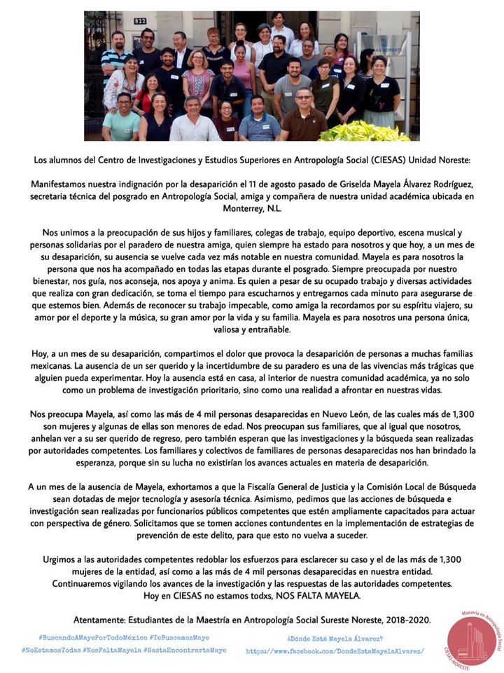 Solicitamos que la Fiscalía se coordine con la Comisión Local de Búsqueda. Asimismo, exhortamos a la comunidad antropológica del país a sumarnos en la difusión de la información relacionada con la búsqueda de Mayela que circula en redes sociales a través de la página de Facebook, creada por las y los estudiantes del Programa de Maestría del CIESAS Noreste: Facebook/DondeEstaMayelaAlvarez, y sumamos nuestra voz a sus voces: #BuscandoAMayePorTodoMéxico, #NoEstamosTodas, #NosFaltaMayela, #DóndeEstáMayela, #TeBuscamosMaye”, externó.